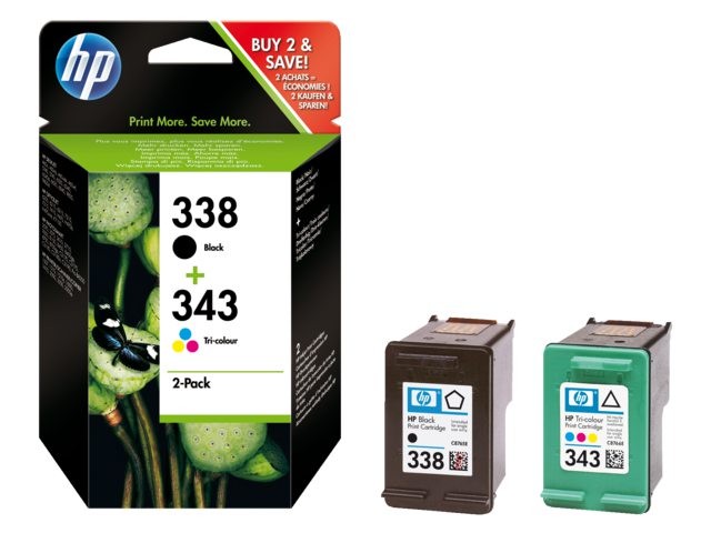 Extra Information | De set bevat:<R><R>1x HP 338 standaard cartridge zwart, inhoud 11ml. 480 afdrukken<R>1x HP 343 standaard cartridge kleur, inhoud 7ml. 330 afdrukken |
