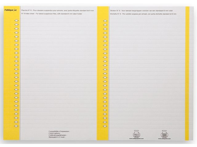 Extra Information | <ul><li>Geschikt voor Elba Medium V en Medium DR hangmappen </li><li>25 stroken per vel </li><li>Breedte 14,4cm en hoogte 6mm </li><li>Met kleurcodering </li><li>Gratis personaliseerbaar via www </li></ul>elbaprint.com. |